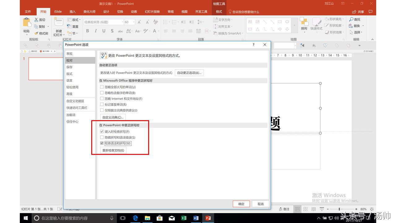我们点击文件-选项-校对,把拼写给打上钩。我们往往做完一份幻灯片的时候会比较累,所以我们去检查幻灯片时,精力会不足,有可能导致我们在幻灯片中会出现错别字。在展示的时候,一个小小的错误会被无限的放大。所以为了避免这种没有必要的错误,我们可以利用幻灯片的自动检查功能来为我们打一下预防针。