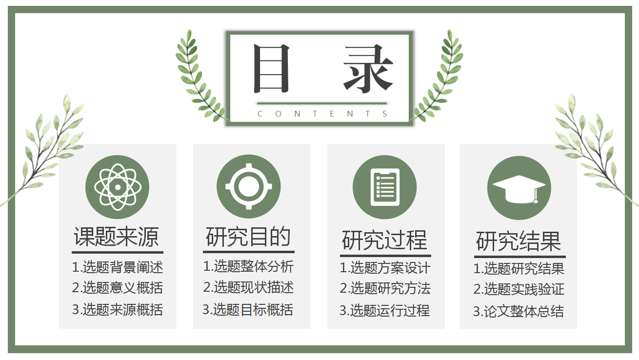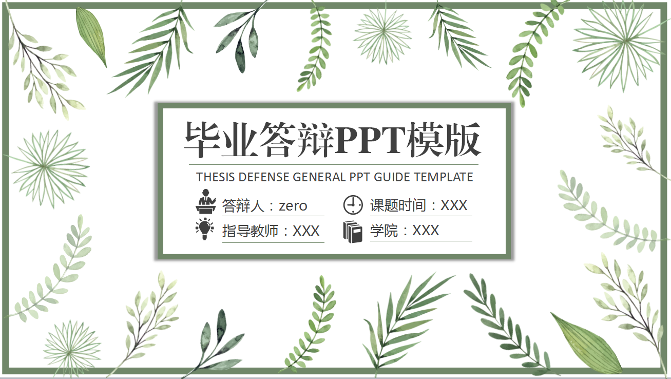 4.请大家点击文章末尾的“了解更多”,在里面找到并关注我,里面有海量各类模板素材免费下载,我等着你噢^^<——非常重要!!!大家请看范例图片,毕业答辩PP他采用绿叶作为装饰设计,清新自然,美观大方。