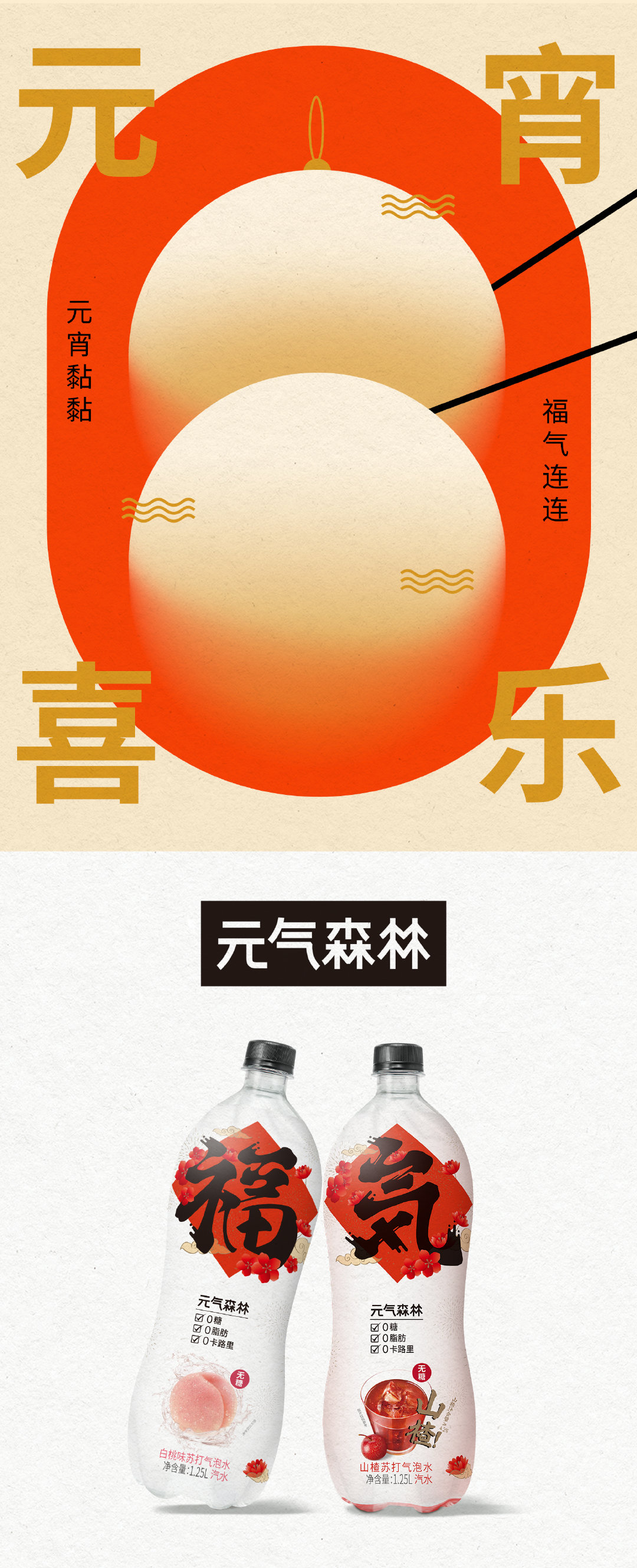 想之前过的元宵节,元气森林也出了一张海报来庆祝,就是下面这张虽然看上起简简单单,但是设计上也是有新意存在的,圆形构成了元宵,也构成了月亮,也像是红灯笼: