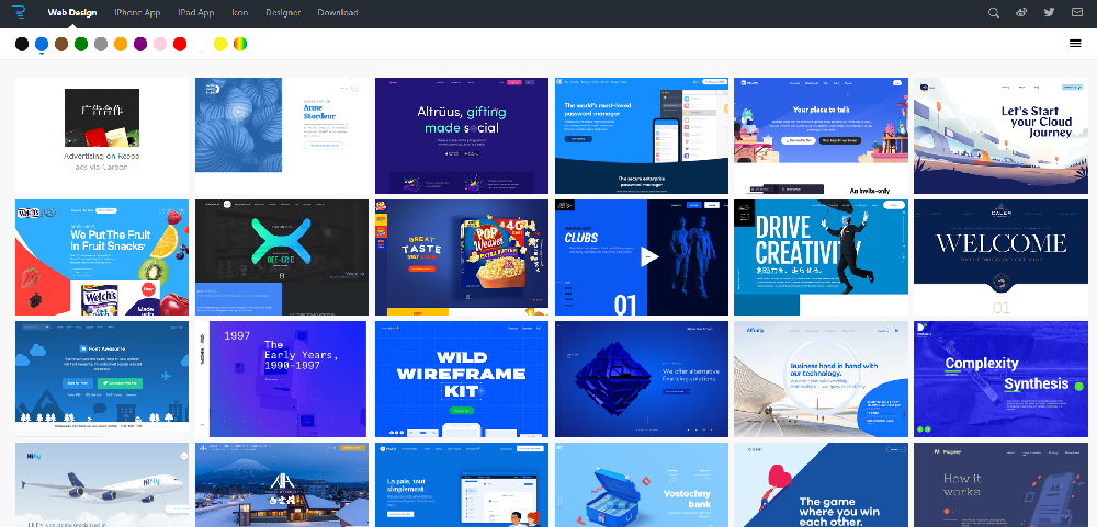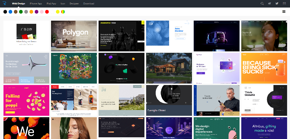 这个网站可以看到很多网站设计作品,并且会根据主题颜色来分类,你可以按照颜色来切换对应主题样式的作品展示。