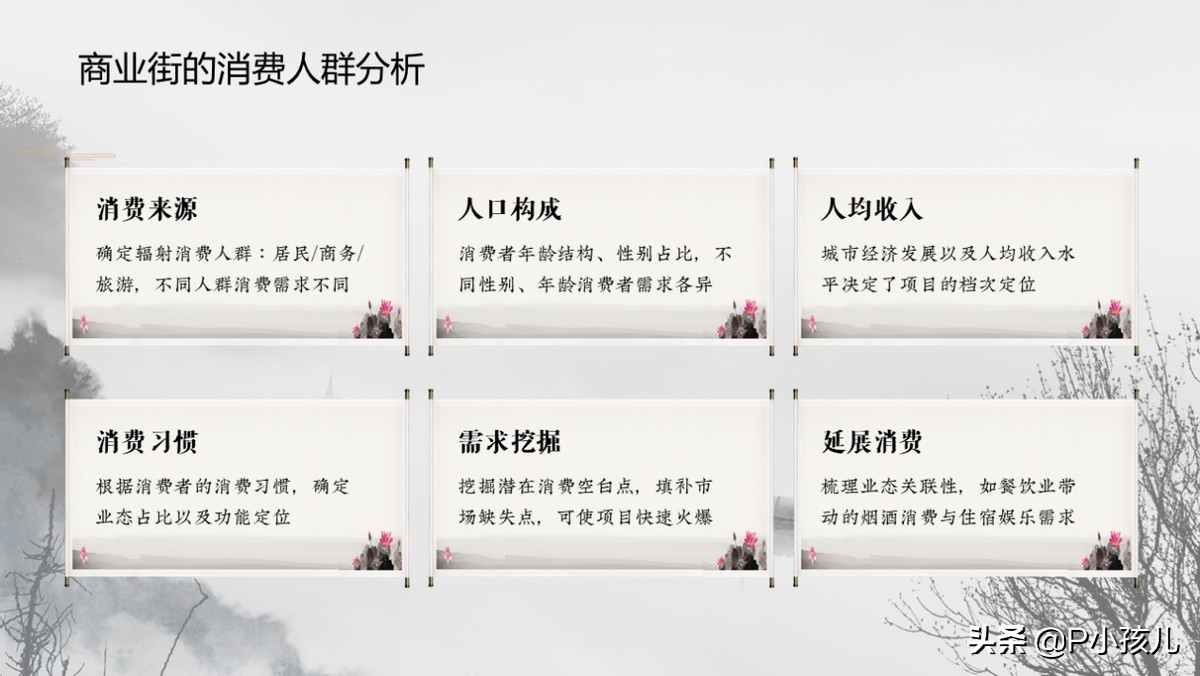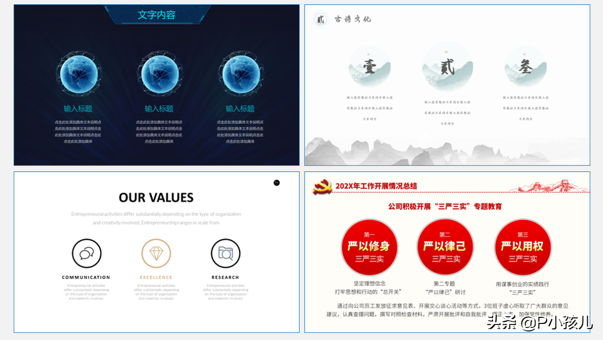 比如要做古诗赏析大部分要用中国风、做企业简介更多用的是商务风,而受众是儿童的时候,更多用到的是卡通风。PPT的风格要和内容一致,做到表里如一。