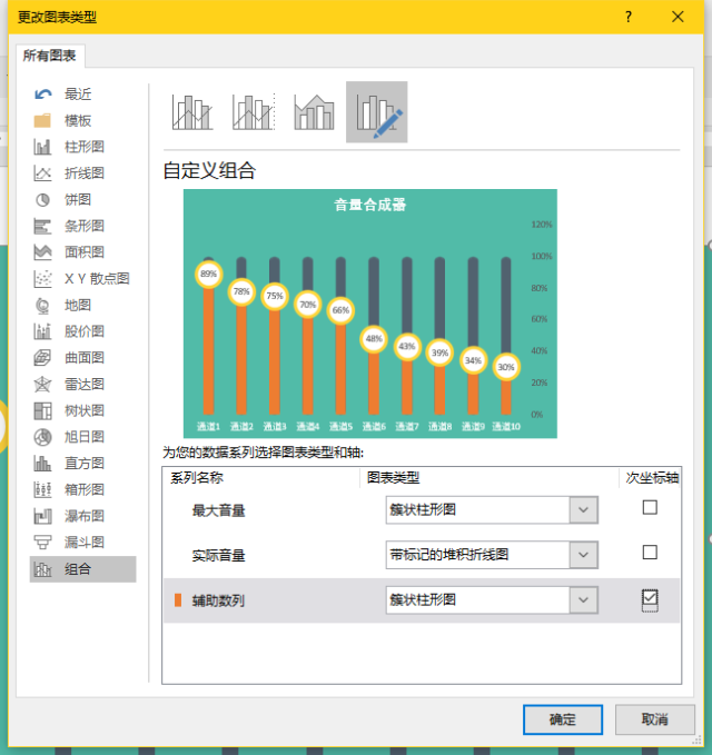 更改一下图表类型,将辅助系列的图表类型更改为「簇状柱形图」,并勾选次坐标轴。