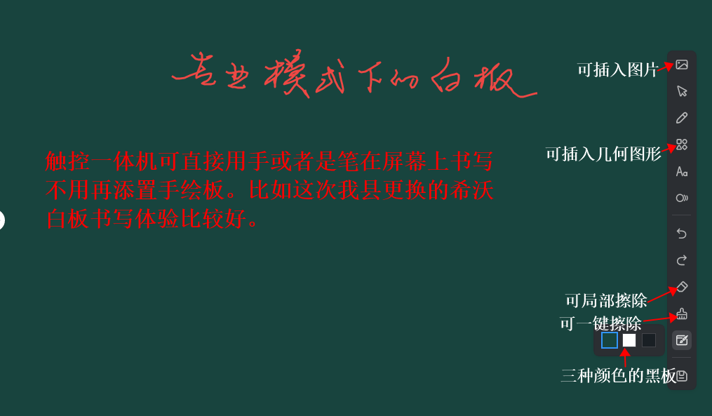 因为本次配置的希沃电子白板是支持手写的,可以用手指或者是笔(专用笔)直接在电视屏幕上书写,就相当于以前在家上网课时用手绘板书写,或者是在平板电脑上书写,手写体验较好。