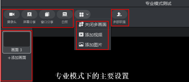 需要说明的是,这种多画面不同于上一种多画面,上一种是多窗口共享一个画面,我们只要设置好这一个画面的声音就行了,而这种模式下这每一个窗口都独立一个画面,每个画面都要独立设置声音,比如老师的麦克风,系统的声音等,而且在授课时,老师要随时切换,比如要显示播放PPT的内容,就要在直播设置页面(上图)中激活相应窗口。如果不激活,你在A班显示的是PPT页面,但在B班可能显示的还是摄像头画面。