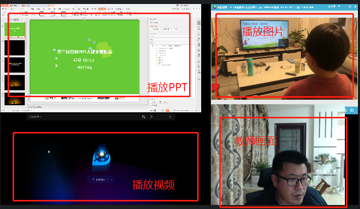 在课中如果需要观看图片就放在第三个画面,需要播放视频放在第四个画面。部分平板电视还带有摄像头,我们也可以将平板电视的摄像头单独放一个画面,这样B班的学生还可能通过平板电视的摄像头看到A班的同学了。