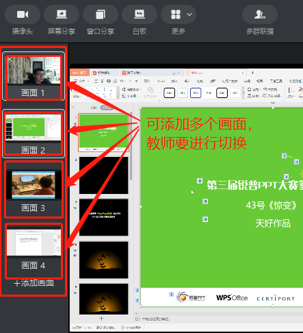 比如我们可以在第一个画面显示摄像头的内容,在刚上课时使用,这样B班看到的就是老师的画面。在正式讲课时,就可以激活第二个画面,第二个画面里面选择的是PPT的窗口分享。