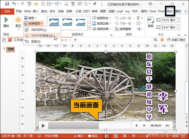 如果视频一点点都不能裁剪,则可以通过添加封面或用视频中的某个画面作为开始时显示的图像,选中视频后切换到“格式”选项卡,单击“标牌框架”选择“文件中的图像”(图2),可以选择一张外部图片作为首帧;也可以将视频播放到需要位置后暂停,然后选择“标牌框架”下的“当前框架”,这样也能将到当前画面设置为视频开始播放前的静止画面。通过这两种方法就能彻底消除视频黑屏。