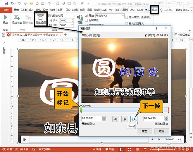如果视频的开始部分的画面有停留(即有较短时间的静态画面),则可以使用对视频稍作一点点裁剪,就能清除掉黑屏。选中视频后,切换到“播放”选项卡,单击“剪裁视频”按钮弹出对话框(图1),单击选中“开始标记”,然后单击“下一帧”按钮,观看画面是否不再黑屏,正常显示后单击“确定”按钮,这样就会看到页面上视频上的黑屏已经没有了。