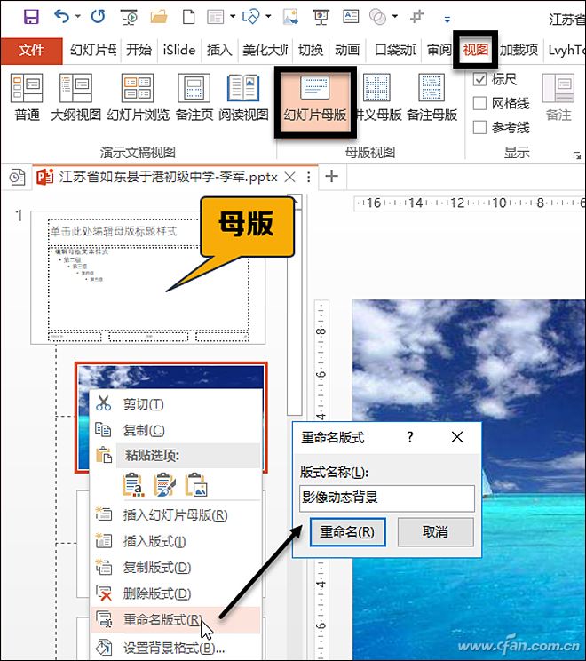 切换到“视图”选项卡,单击“幻灯片母版”进入母版编辑状态,在母版下方任选一个版式(图3),然后切换到“插入”选项卡,将视频影像插入到该版式中,调整尺寸让视频满屏。如果影像开始显示为黑屏,可以通过上面介绍的方法清除黑屏,然后右击该版式选择“重命名版式”弹出对话框,输入版式名称为“影像动态背景”,最后关闭母版视图。