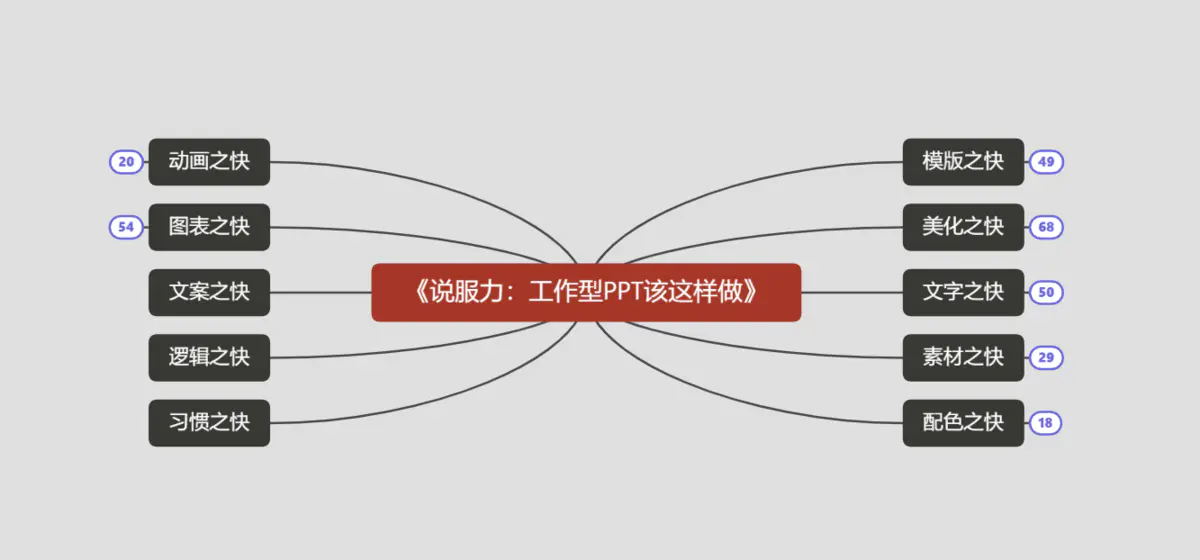 作者秦老师是通过模板、美化、文字、素材、配色、动画、图表、文案、逻辑、习惯10个部分讲解。书上还有图片,方便理解学习。我看完之后觉得可以把逻辑之快放第一位讲,文案之快居二,其他再接上。