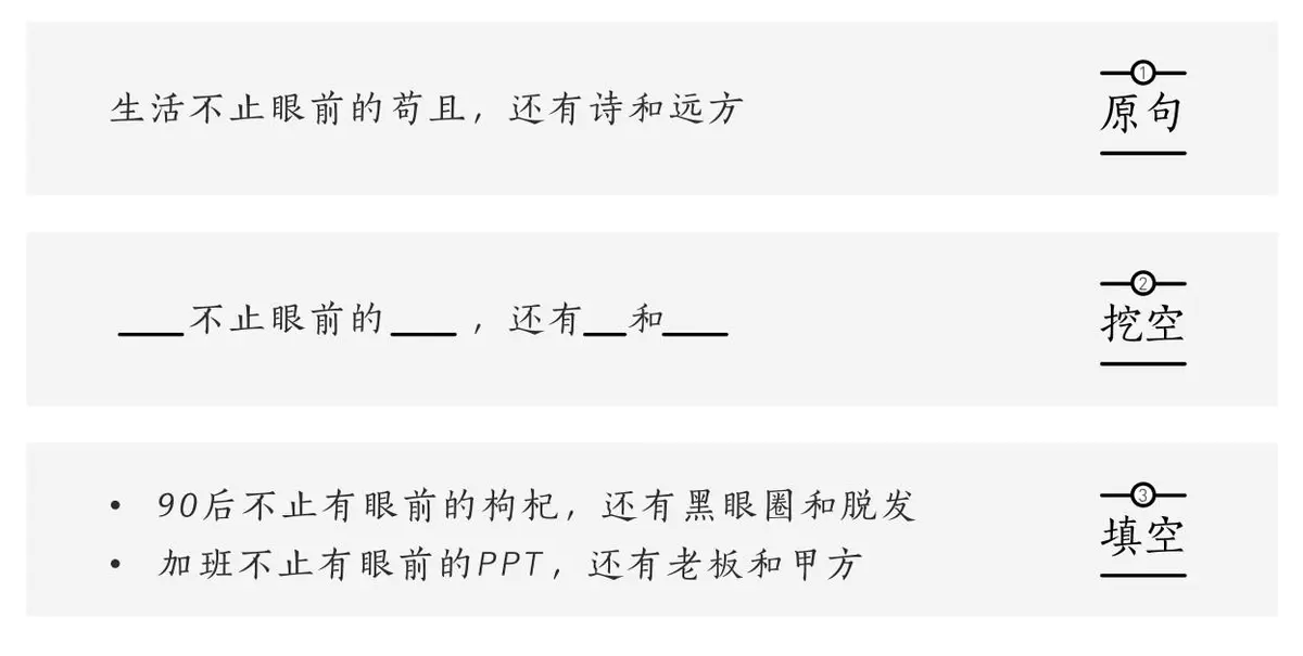对耳熟能详、传播广泛的金句做二次加工,先拆解原句结构,然后做关键词挖空,最后再进行替换填空。