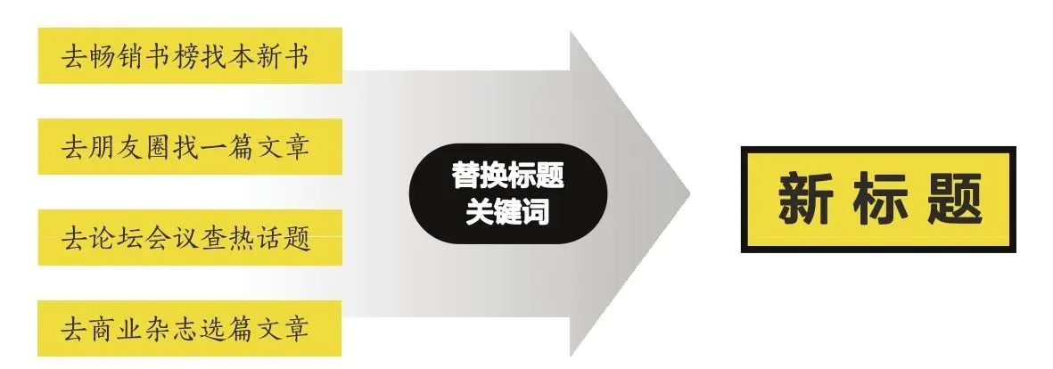 通过微信10万+文章、畅销书、热门话题、商业杂志图书等地方参考标题,平时积累好标题,拆解、替换、归档成自己的标题。