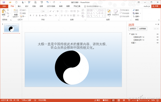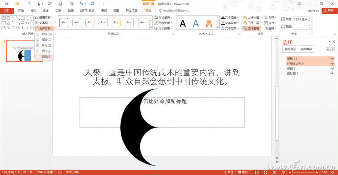 在PPT设计中,很多时候为了能够让观者耳目一新,我们经常需要在幻灯片中插入一些组合图形。比如笔者在制作一份关于中国传统文化PPT时,为了突出传统,这里需要插入一个代表中国传统文化的太极图标。这个图标看似复杂,其实只要用好PPT的形状组合功能即可。