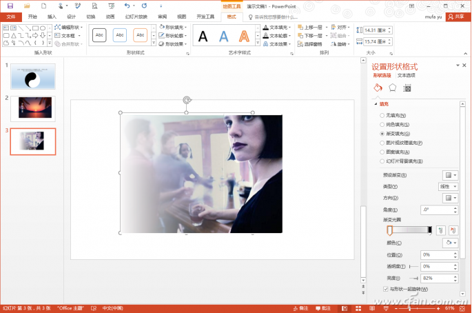 选中插入的矩形和多边形,点击“格式→形状→联合”,将两个插入的图形联合。选中联合图形,将其轮廓设置为无,填充设置为“渐变色”、方向“向右”、透明度设置为0,这样就可以得到类似示例中的蒙版效果了(图10)。当然我们也可以通过填充其他颜色(如填充白色则只保留美女图片)来获得更多处理效果。