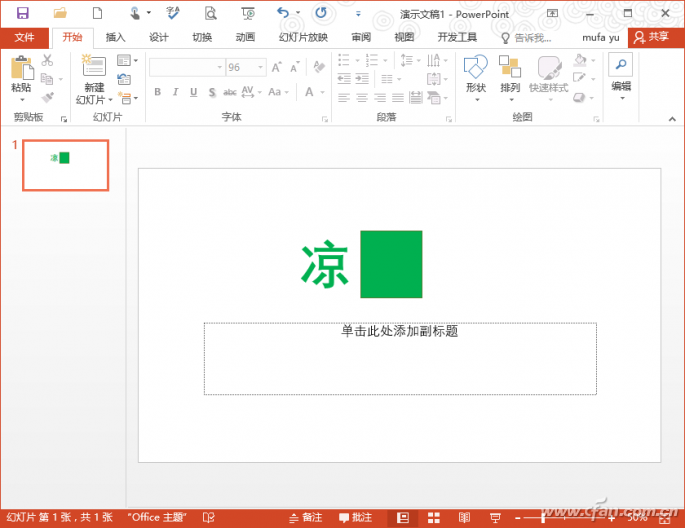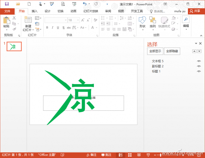 同上在幻灯片中点击“插入→文本框”,插入一个需要变形的字体如“凉”字,切换到“开始→字体”,将字号设置为“96”,字体加粗。继续插入一个大小和字体一致的矩形,填充色设置为和字体颜色一致,无轮廓(图5)。