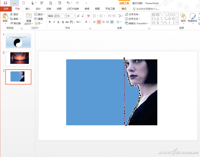 在PPT中插入原图,点击“插入→形状→矩形”,插入一个合适大小的矩形,并将矩形的右侧边缘调整到美女头部额角位置。点击“插入→形状→任意多边形”,将多边形的区域设置为美女头像和矩形之间的区域。由于多边形无法精确勾勒脸部区域,可以右击选择多边形“编辑顶点”,拖动鼠标将多边形的顶点编辑的和脸部区域尽量贴合(图9)。
