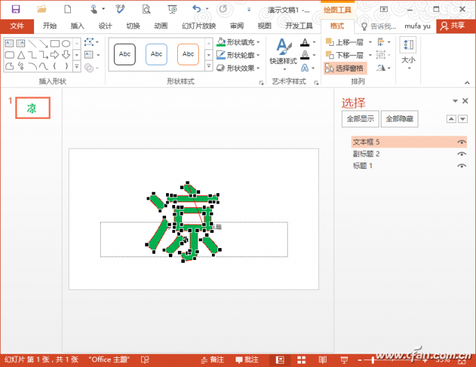 比如PPT的主题是为了突出“凉”,那么可以通过对其偏旁的拉伸制作出夸张的变形以突出PPT的主题,当然大家还可以根据自己需要任意进行更多的变形操作(图7)。