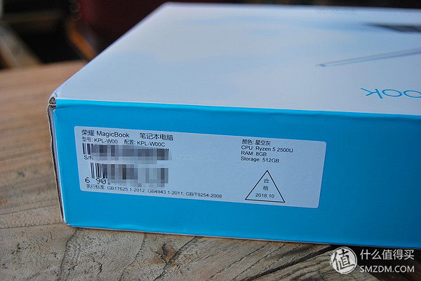 笔记本的型号信息在包装的侧面,在标签的左侧是型号和SN号,右侧则是颜色和配置情况,我这台测试的笔记本配置为:CPU:AMD瑞龙5-2500U;内存:8G;硬盘:512G,颜色为星空灰。