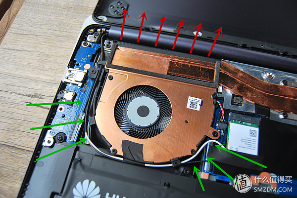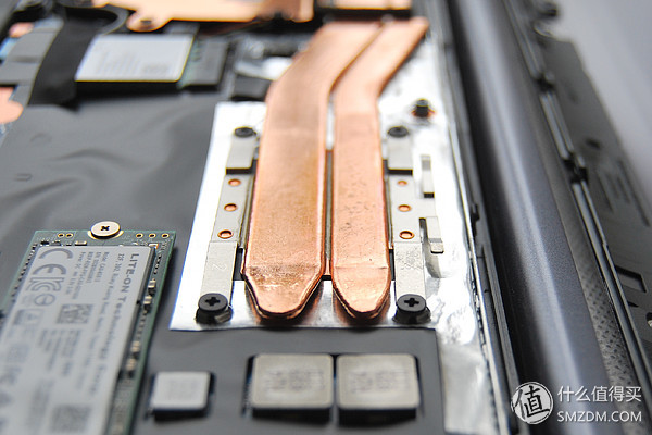 该位置下方应该是AMD的那颗Ryzen5 2500u了,通过两根扁热管将热量传导到涡轮散热器。