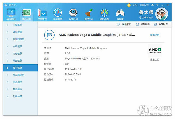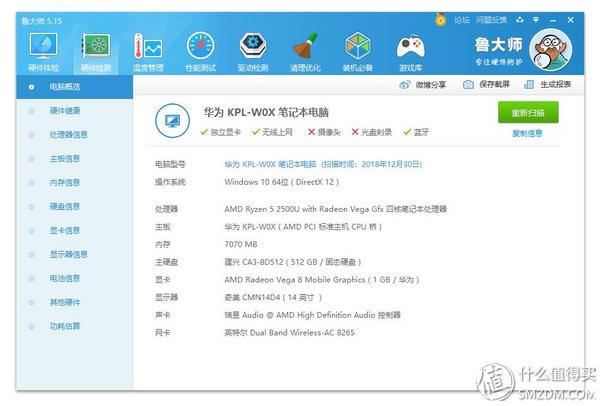 安装“娱乐大师”鲁大师进行硬件检测,识别到这款荣耀MagicBook的配置情况,CPU处理器为AMD Ryzen5 2500u,主板为华为荣耀定制款,内存显示为7070MB,可能一些电脑小白用户觉得不是说好了8G内存吗?怎么只有显示7G了?其实还有1G用于核显的显存了,在显卡项里可以看到显存1GB。硬盘使用了建兴的512G固态硬盘,显示器为奇美14英寸全高清显示器。