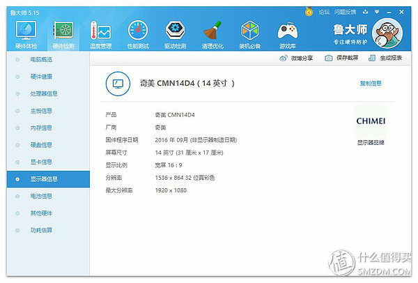 荣耀MagicBook的屏幕为14寸的1920*1080分辨率全高清屏,雾面屏,我个人比较喜欢的类型,办公不晃眼睛,加上护眼模式加成,使得长时间的使用不会累。从娱乐大师的信息看为奇美的产品。