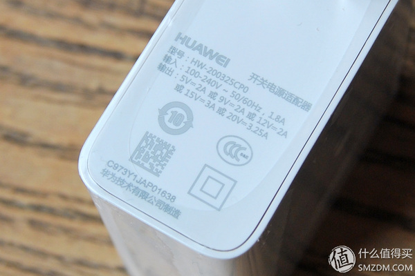 PD快充头,型号为HW-200325CP0,100-240V的宽压支持,输出:5V/2A或9V/2A或12V/2A或15V/3A或20V/3.25A。看来其型号200325表示了其最高为20V/3.25A的输出,换算成功率为65W,所以这款是支持最大65W的PD快充头。