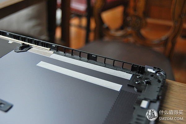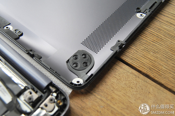 除了四个脚垫,底面靠上的位置还有一个黑色的突起,不会让笔记本正面受压变形。