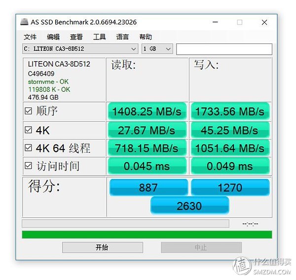 建兴的M.2接口固态硬盘,512GB的容量,一般来说同一型号大容量的版本数据上更好些,通过AS SSD BENCHMARK实测得分2630分,对于办公笔记本来说,完全OK。而且可以看出预置系统是4K对齐的。
