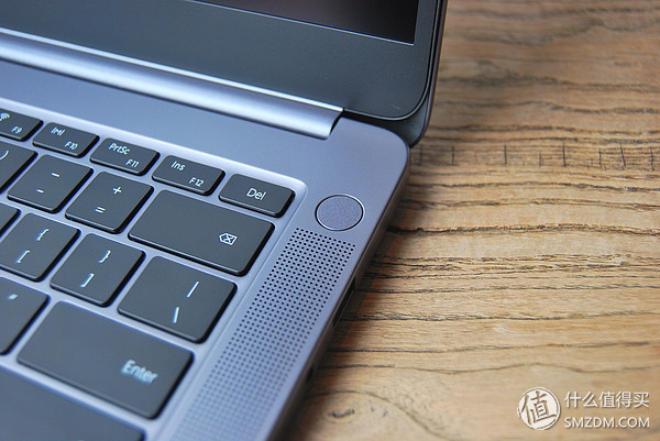 笔记本的开机键在C面右侧喇叭口上方,圆形的开关。