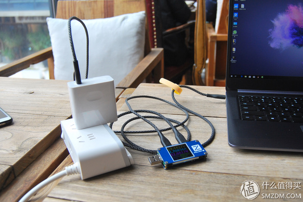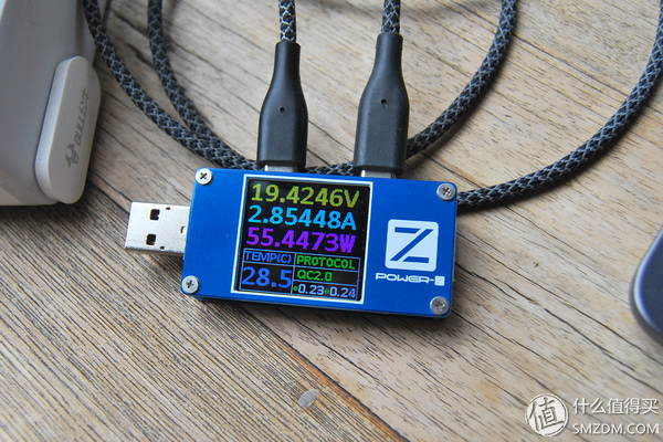 测试用的老一代POWER-Z表,显示为19.4V/2.85A,功率达到了55.45W,效率逼近充电头最大输出,毕竟线材和输出过程中也是有损耗的。