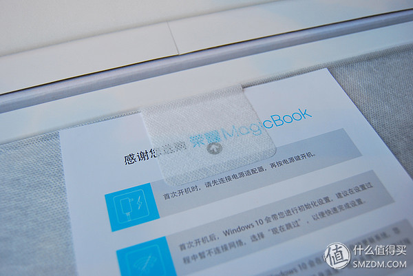 开箱的瞬间总是激动的,荣耀MagicBook笔记本像我们的手机平板包装一样,一打开包装盖就看到产品主体了,为了保护产品完好,在产品外还装了一个无纺布袋。