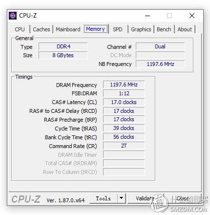 内存方面,通过两款软件测试,使用了DDR4的8GB双通道内存,频率达到了2400Mhz,时序为17-17-17-39。