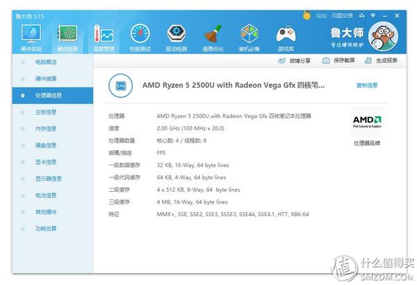 这颗AMD Ryzen5 2500u处理器,是笔记本的核心,性能的核心来源,AMD在近两年来,依靠Ryzen系列翻了身,4核心8线程,默认主频2GHz,最大睿频3.6GHz,15W的低功耗的设计,保证性能的同时还能依靠低功耗来达到长续航的目的。