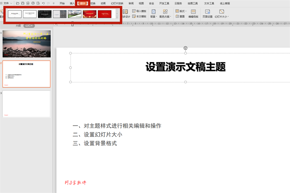 新建一个幻灯片,单击上方设计按钮,在下侧工具栏中会出现软件自带的几个主题模板