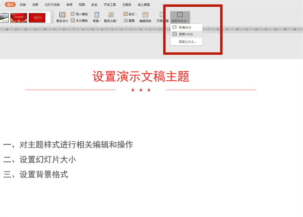 接下来我们看一下幻灯片大小的设置,单击幻灯片大小按钮,可以对幻灯片大小进行调节