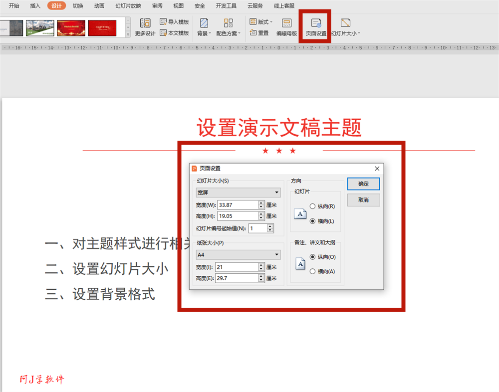 也可以单击页面设置,在弹出的对话框中对幻灯片进行更细节的调整