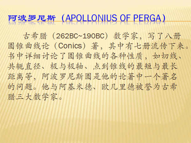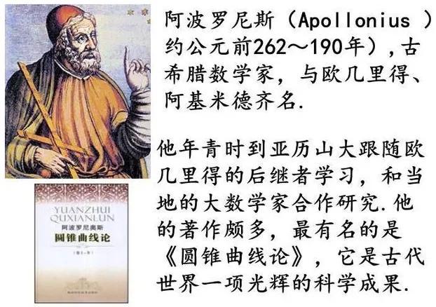 阿波罗尼斯是古希腊数学家,与欧几里得、阿基米德齐名。他的著作《圆锥曲线论》是古代世界光辉的科学成果。阿波罗尼斯圆是其成果之一。