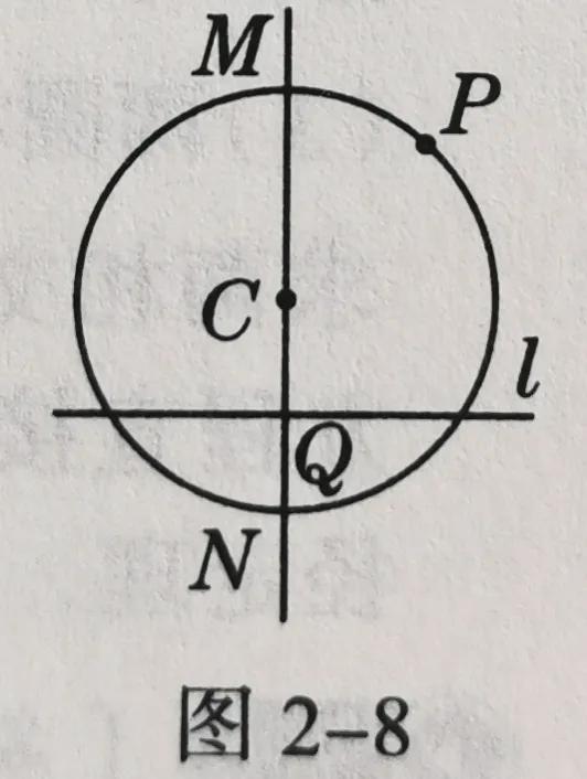 (2)若直线l与圆相交,则点P到直线l的距离的最小值为0,最大值为|MQ|=|CQ|+r,劣弧上的点到直线l的最大距离为|NQ|=r-|CQ|,如图2-8所示。