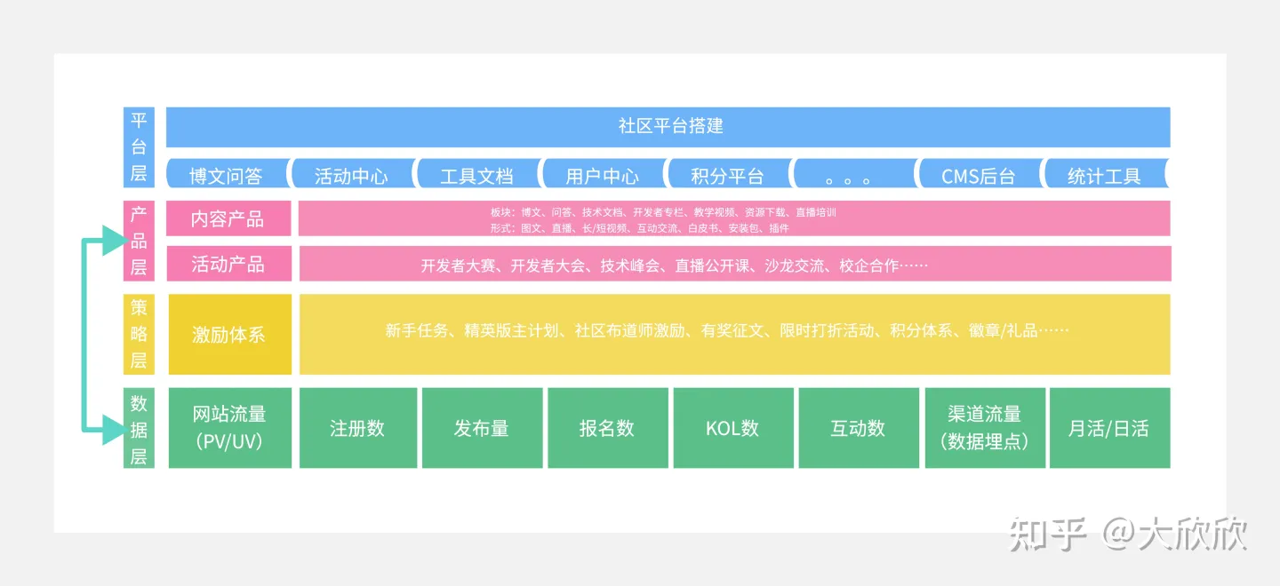 其中平台层面与数据层面为相互支撑的循环关系,运营同学利用内容体系及活动策划等方式活跃社区,数据层面针对各运营动作统计数据,并作出分析比对,从而支持内容及活动的优化调整,为社区运营良性循环奠定基础。