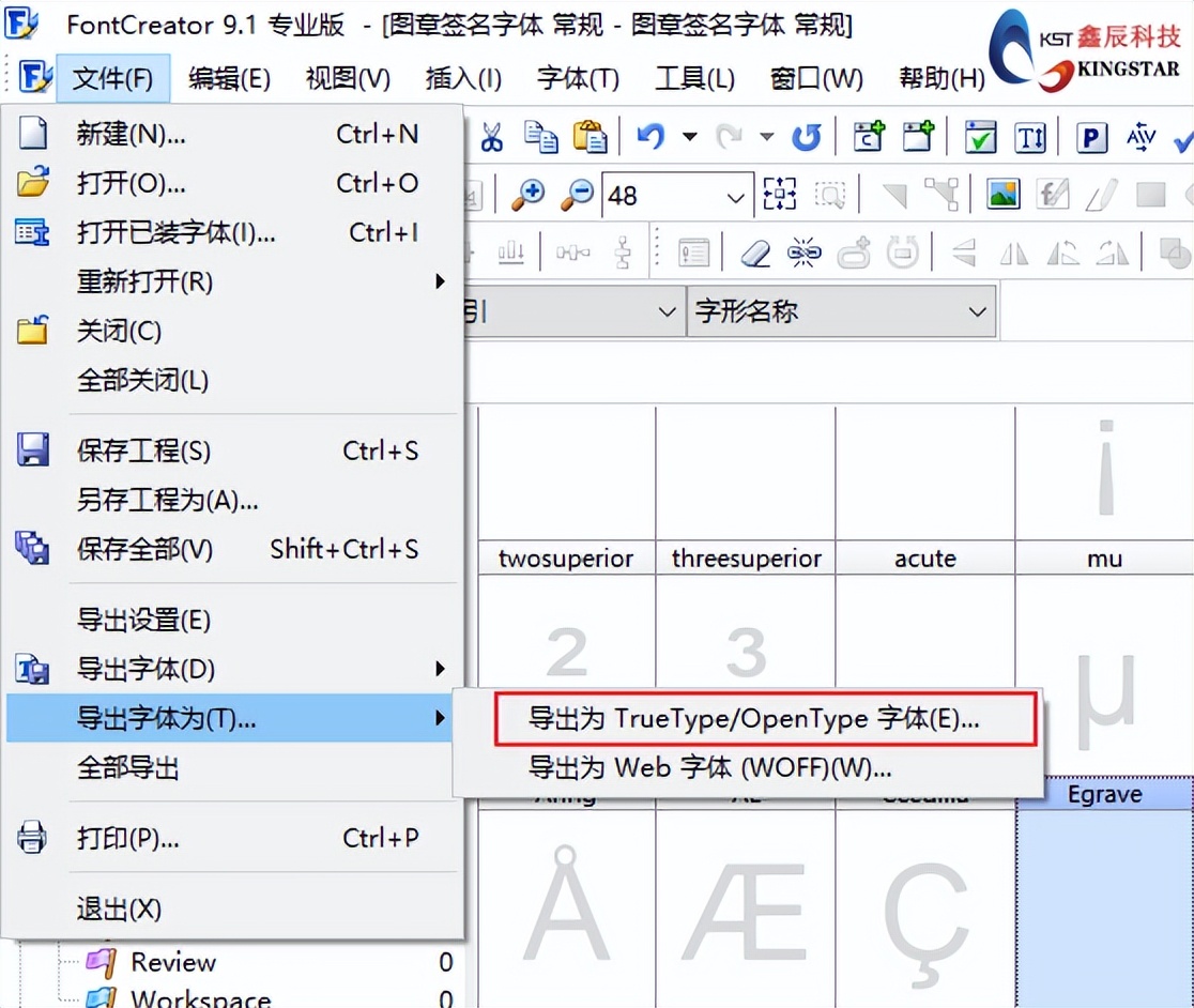 将所有需要添加的图像分别选择字形进行添加,完成后点击保存项目,最后点击【文件】-【导出字体为】-【导出为Turetype字体】,保存类型选择为【TTF格式】,由于SOLIDWORKS eDrawings不支持OTF格式字体,建议全部生成使用TTF格式字体进行使用。