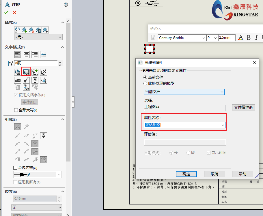编辑图纸格式,在左上角生成注释,在注释当中设置链接为自定义属性值