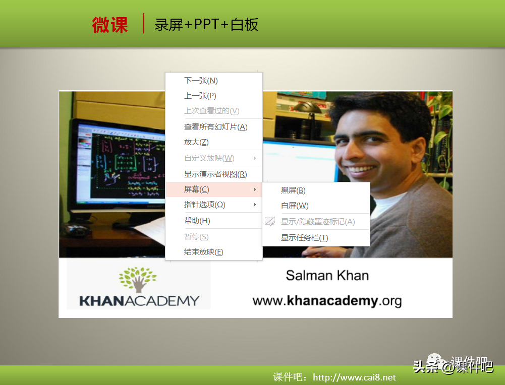 第二种方案就是使用PowerPoint。在演示文稿放映时右击,选择级联菜单中的“屏幕”命令,在下级菜单中选择“黑屏”或“白屏”命令设置屏幕的颜色,如图10所示。
