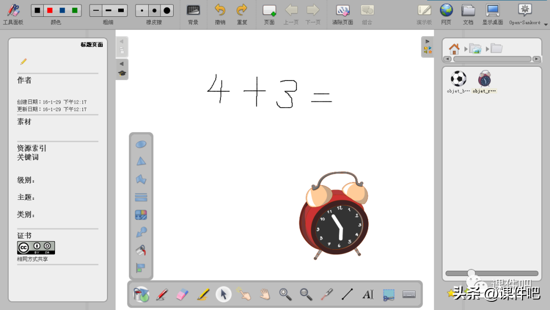 “可汗学院”模式微课在软件的使用上除了需要录屏软件之外,还需要电子白板软件用于在屏幕上模拟书写用的黑板,屏幕上黑板的颜色可以是白色也可以是传统的黑色。计算机中可以使用的电子白板类软件比较多,比较著名的如Open-Sankoré,其功能强大且没有绑定硬件,如图8所示。