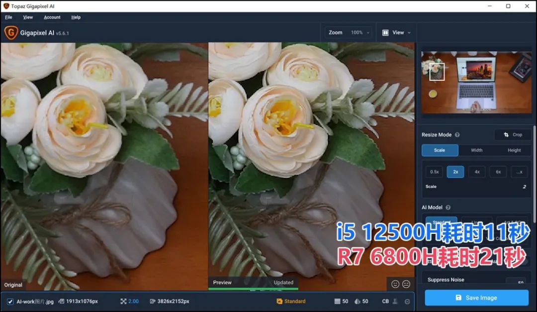 而在Part3的最后,我们再引入一类“时髦应用”的测试——AI图像。这两三年,AI应用已快速进入各种应用领域,尤其是图像编辑领域,应用很广泛,如Ps就有各种AI功能,智能选择和填充、一键换天、智能色彩等。我们的测试为AI图像放大与细节重塑——这在商业应用中已逐渐普及:大家往往会为图像精度达不到要求而苦恼,而通过Gigapixel AI,就能利用AI算法进行最高6倍放大并重塑图像细节,满足高精度需求。