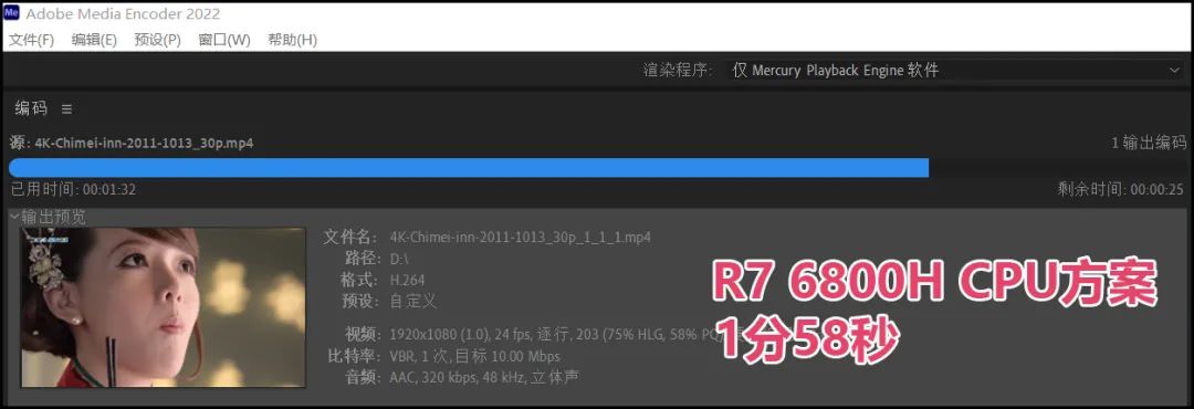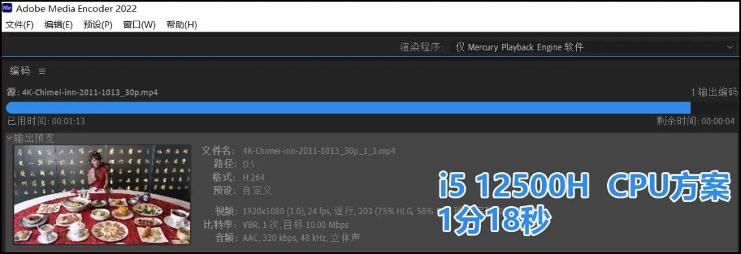 ▲Me(Media Encoder)视频转码,将4K@30fps的《烤鸭》转码为FHD@24fps。由于两款机型的处理器功率释放都不错,所以直接采用“仅Mercury Playback Engine软件”方案,也就是CPU方案,效率最高(提示:尽管是CPU方案,但GPU和CPU都会较高负载的参与运算)。而i5 12500H比R7 6800H少耗时高达34%!