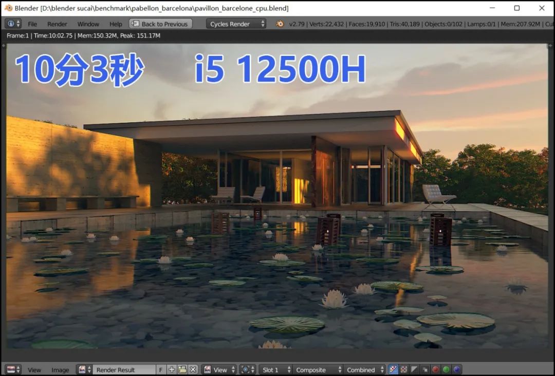 当然,三维渲染也不是只有Cinema 4D这一款应用。下面我们更换了测试软件,采用Blender,它也是非常流行的建模和渲染软件,还可调用多种渲染引擎。这里我们依然采用CPU引擎,渲染官方提供的样张▼: