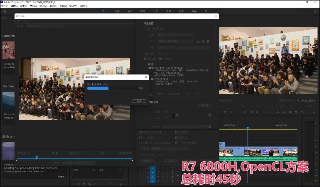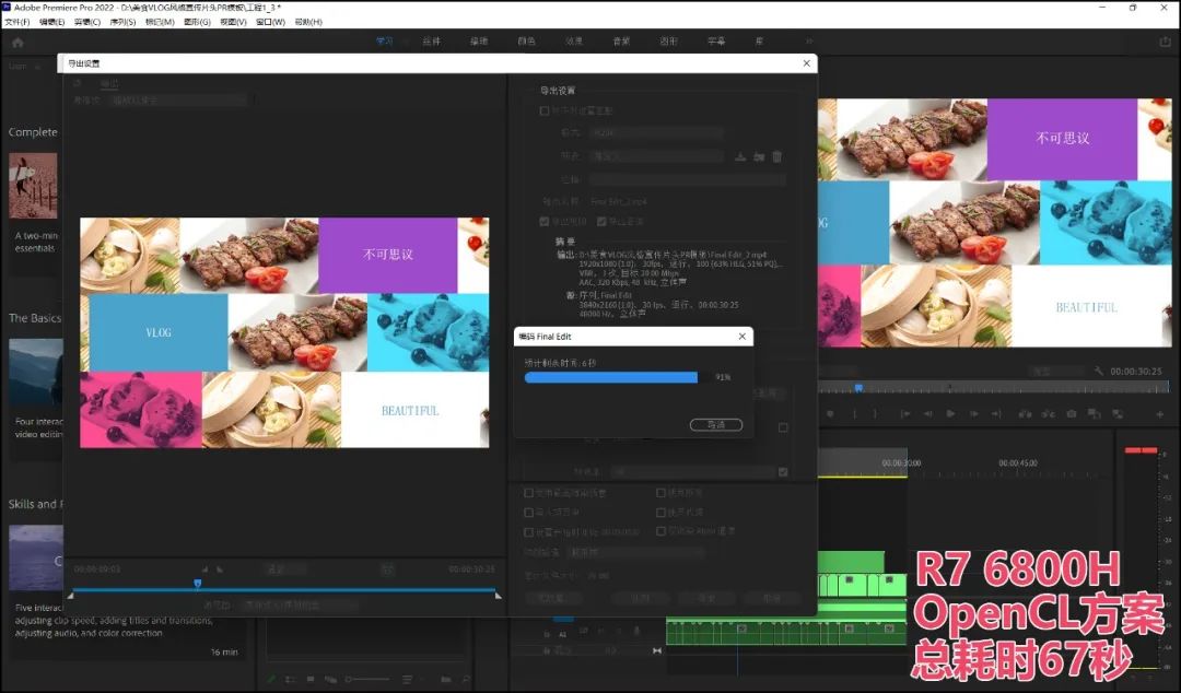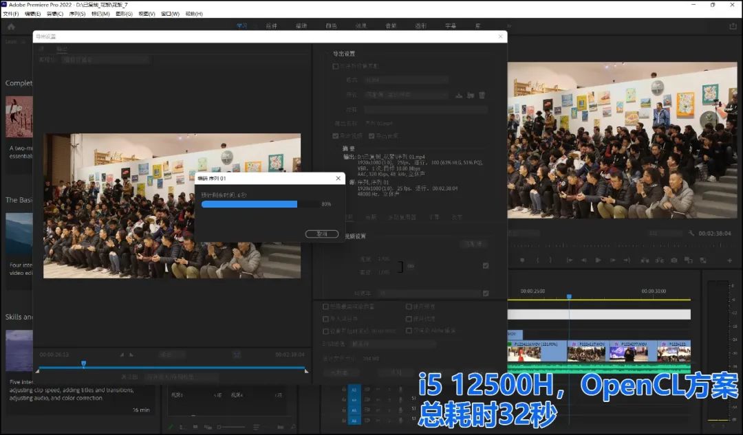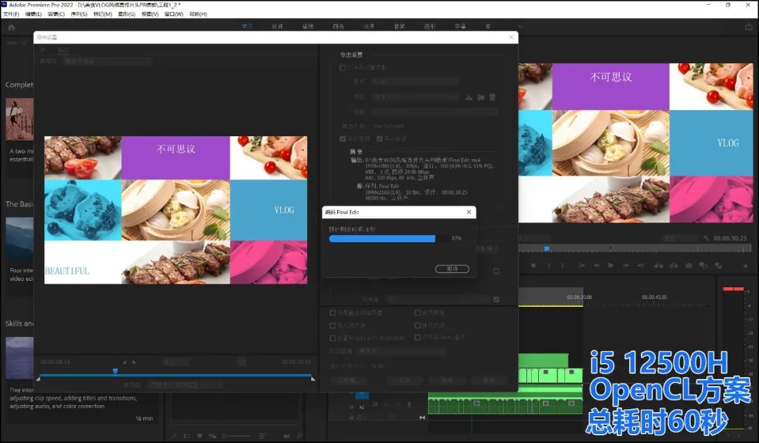 ▲Pr还有一类负载更高的应用:生成视频。这在宣传类视频中常见,比如,我们用一堆超清的美食图片(5K分辨率),用Pr组合成一个带转场特效的美食宣传视频。这个应用的负载比单纯的视频镜头剪辑高不少,依然是选择OpenCL方案,由显卡主导计算更为高效。而在总体耗时上,得益于Iris Xe集显对视频编辑软件的良好支持,i5 12500H依然少耗费10%的时间。