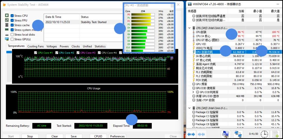 ▲酷睿i5 12500H款Neo 14的处理器功率释放情况则相对复杂:它的爆发功率高达80W,且在2分钟内保持较慢的速度缓降,在到达2分钟时,也能保持60W+;而后,继续缓降至50W,最终在50W~64W这个较大的范围内缓慢、往复波动(从左侧考机温度图的锯齿状可看到这一规律),而处理器频率较高值为P核3.8GHz、E核2.7GHz;处理器内部温度在88℃~100℃波动,大部分时候在93℃~96℃波动。