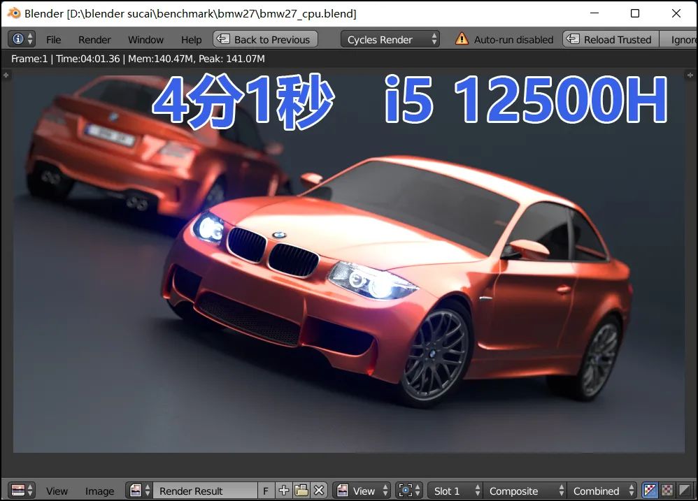 ▲BMW汽车样张,渲染耗时相对较短,i5 12500H耗时4分1秒,R7 6800H耗时4分7秒,酷睿平台微幅胜出。