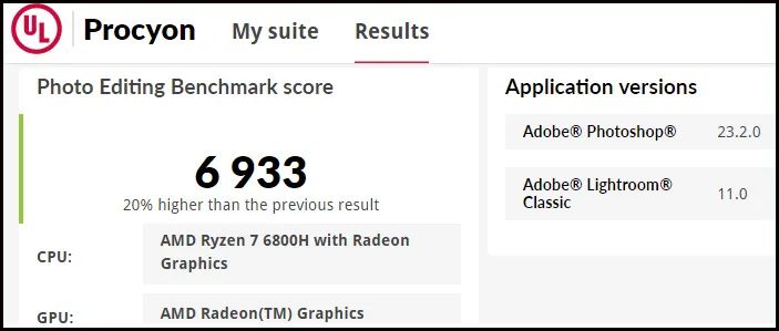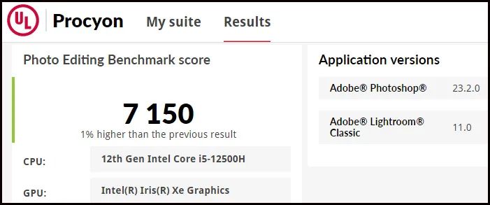▲测试结果再度出乎意料:尽管R7 6800H的Radeon 680M集显相对于i5 12500H的Iris Xe集显更强,但在Procyon的照片处理测试中,后者再度胜出,领先幅度为3%。